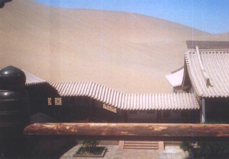 敦煌 郊外の砂丘の麓には仏寺が立てられている。新しいのは改築されたかあるいは観光用の新築か。 |