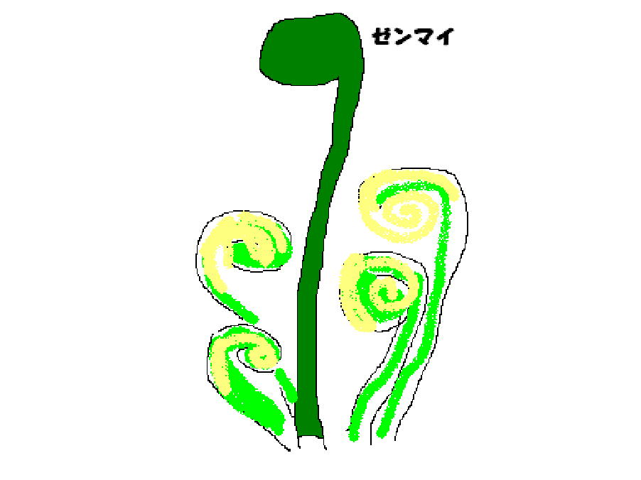 ここの「ゼンマイ」は大抵「家族」で生えている。「オトコゼンマイ」と呼ばれる硬くて食べられない背高な奴が「家族」を守るように立っていて、その根元には、綿帽子をかぶった女こどもの「ゼンマイ」が4〜5本ずつぎっしりと生えているのである。